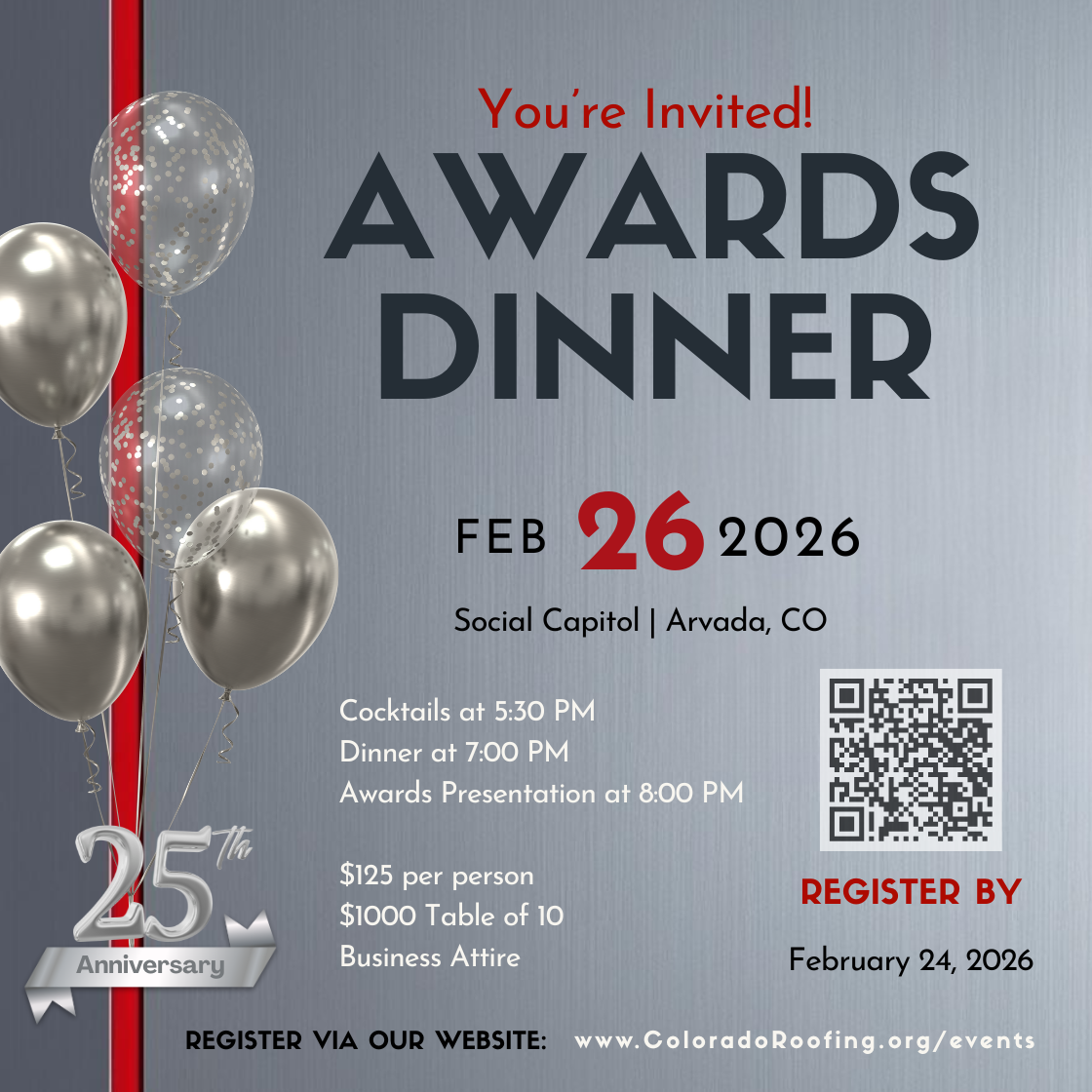 Get ready for an unforgettable evening as we celebrate the “Best of the Best” in Colorado’s roofing projects and shine a spotlight on the incredible achievements of our members! We’ll be recognizing top contractors in both steep and low-slope roofing and honoring one outstanding individual with a prestigious lifetime achievement award for their amazing contributions to Colorado’s roofing industry!